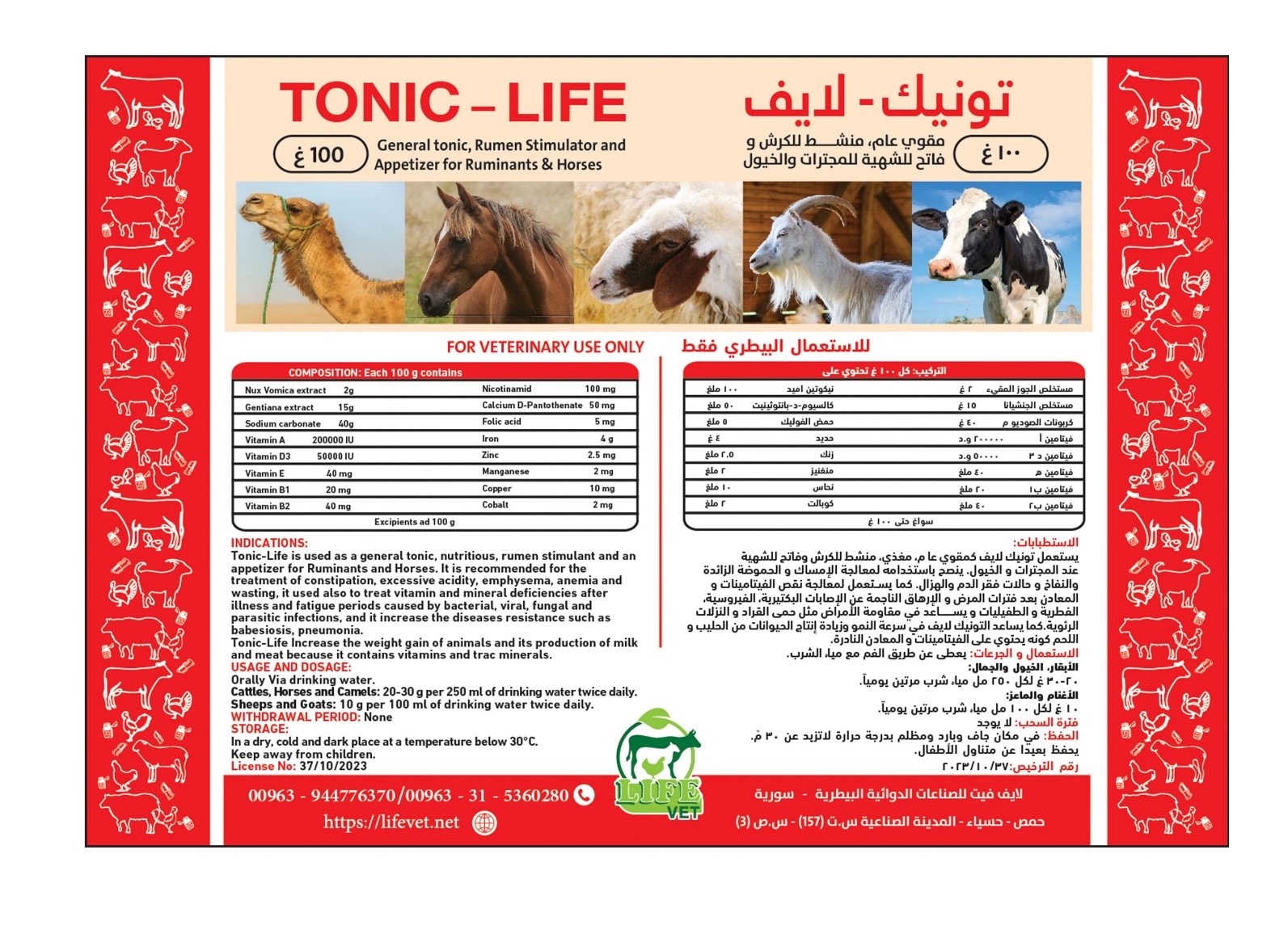 يستعمل تونيك لايف عند المجترات والجمال والخيول كمقوي عام، مغذي، منشط للكرش وفاتح للشهية