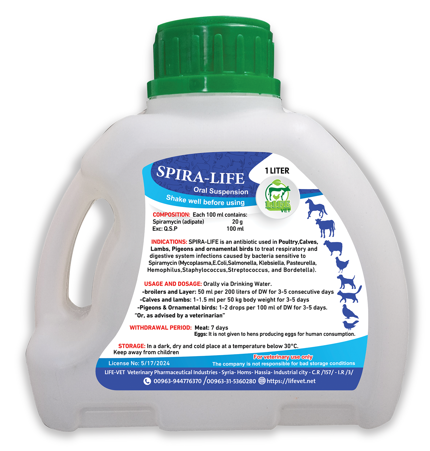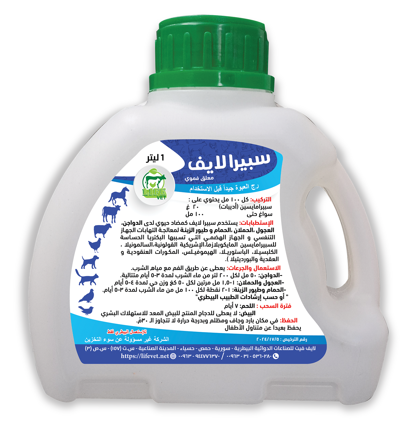 يستخدم سبيرا لايف كمضاد حيوي لدى الدواجن، العجول، الحملان، الحمام وطيور الزينة لمعالجة التهابات الجهاز التنفسي والجهاز الهضمي التي تسببها البكتريا الحساسة للسبيرامايسين المايكوبلازما، الإشريكية القولونية،السالمونيلا ، الكلبسيلا، الباستوريلا، الهيموفيلس، المكورات العنقودية والعقدية والبورديتيلا )