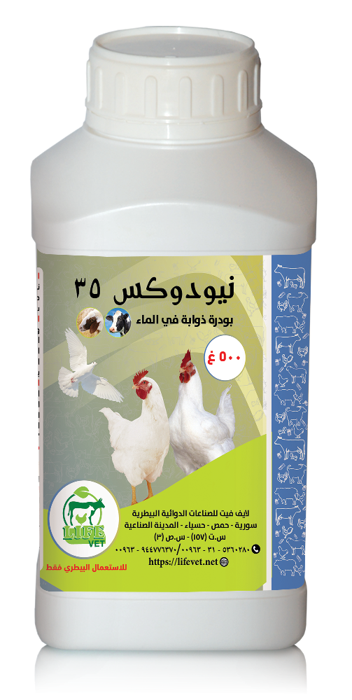 يستعمل نيودوكس 35 عند كلاً من الفروج والعجول والحملان لمعالجة الأمراض التنفسية (المرض التنفسي المزمن، التهاب الجيوب، التهاب القصبات والأكياس الهوائية)، الانتانات المعوية المسببة بالجراثيم سلبية الغرام (العصيات القولونية، السالمونيلا) وعدوى المفاصل بالمكورات العنقودية والعقدية